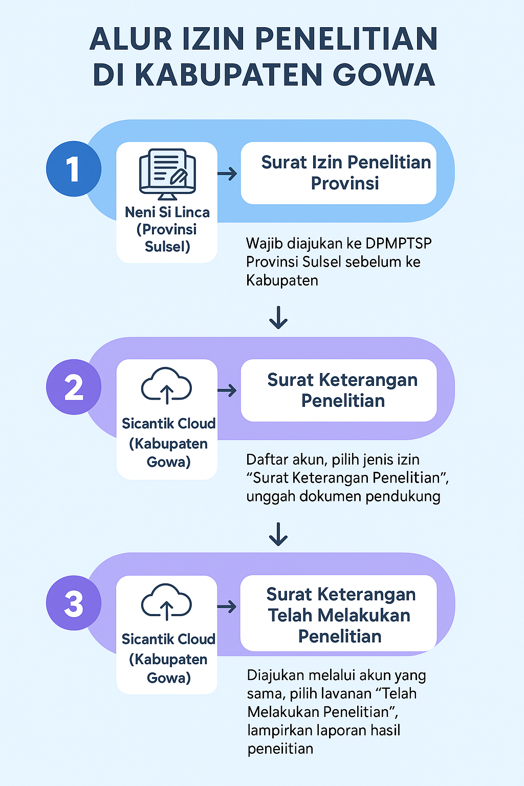 👉 Jadi, sebelum memulai penelitian di Kabupaten Gowa, pastikan sudah mengurus izin secara resmi. Dan setelah penelitian selesai, jangan lupa ajukan Surat Keterangan Telah Melakukan Penelitian agar administrasi riset Anda tercatat dengan baik.